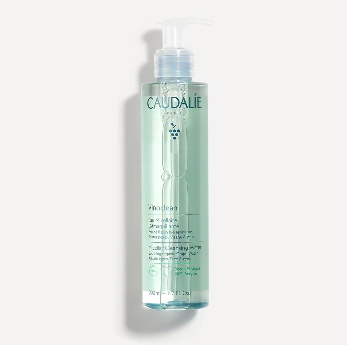 This vegan cleansing water removes make-up and cleanses the face in one step. Packed with Grape water to hydrate and soothe even the most sensitive skin, it efficiently removes makeup from the face while protecting its natural moisture barrier. Skin is clean, soft and comfortable.