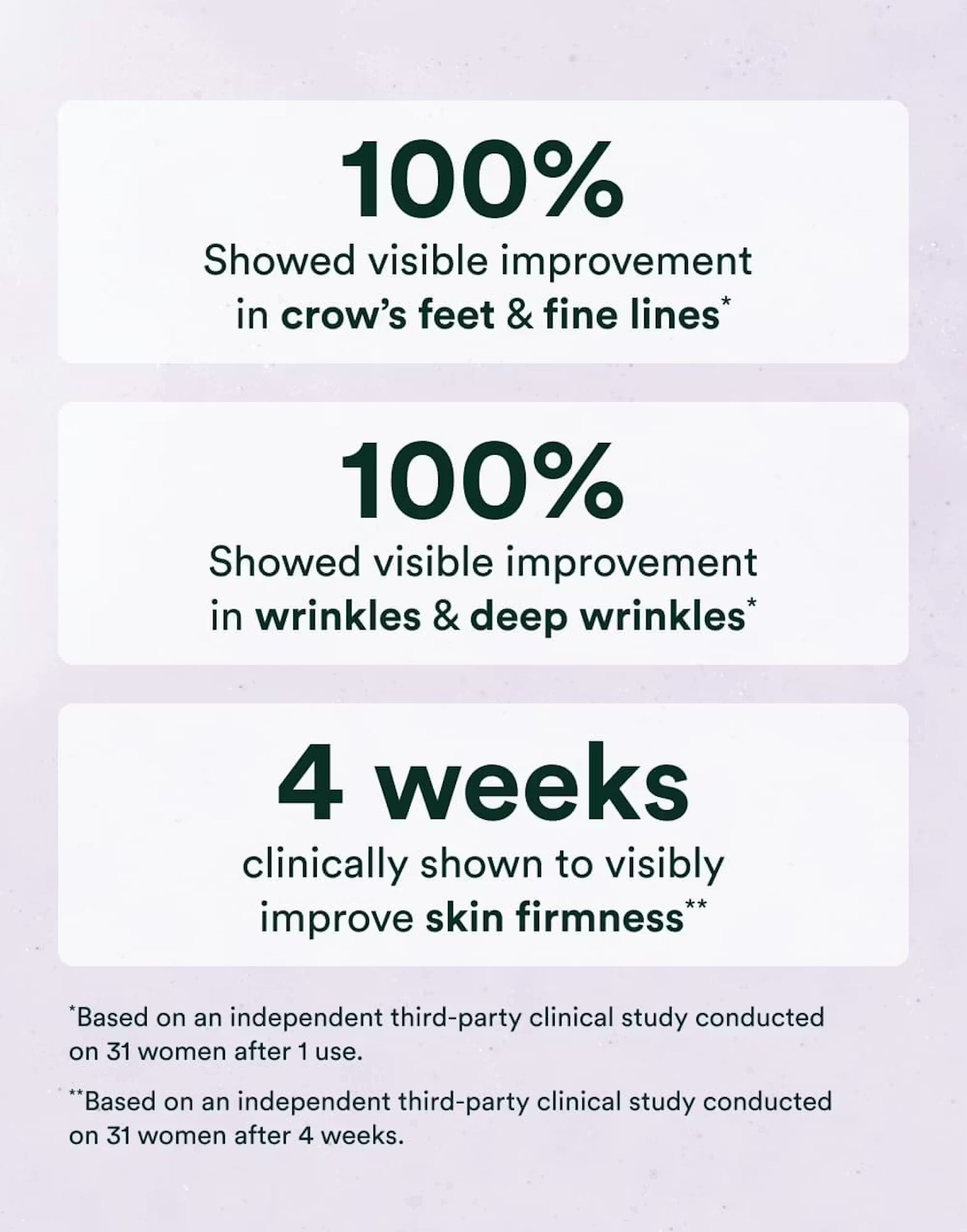 - Visibly reduces crow’s feet, fine lines, wrinkles & deep wrinkles (instantly and long term)