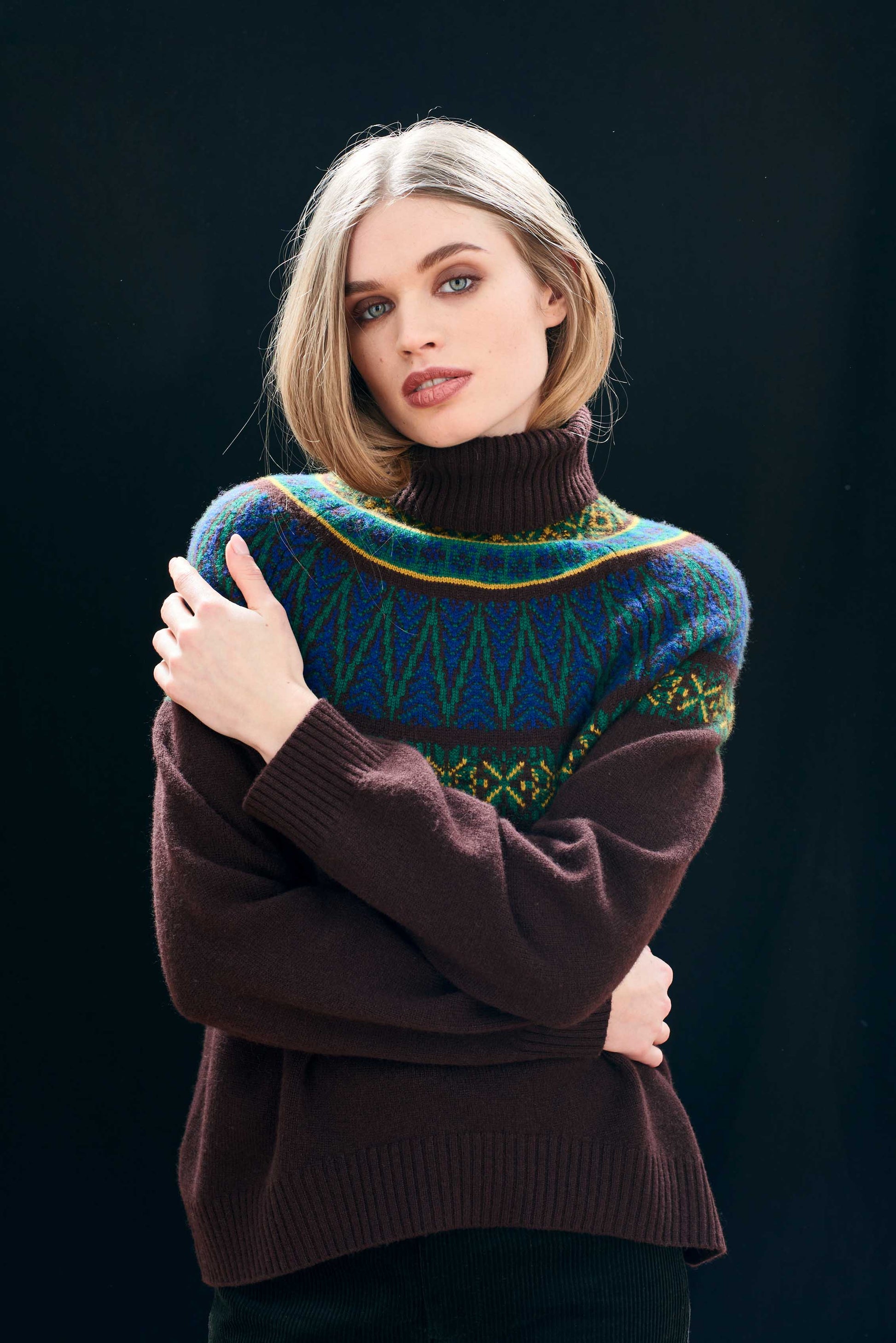 Jumper 1234 cashmere and wool jumper. Our cashmere and wool blend roll neck in dark brown with a fabulous Fair Isle yoke in shades of blue and green. Generous fit and slightly longer at the back and also available in oatmeal. We love this jumper!