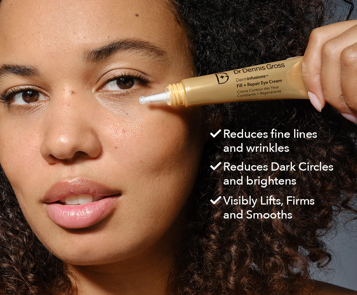This creamy, rejuvenating eye treatment instantly fills the contours of the eyes by combining the powers of 2 sizes of hyaluronic acid molecules and a peptide complex that plump the tear troughs to brighten, tighten, treat dark circles, and correct the appearance of sunken eyes. Kakadu plum, ectoin, and bisabolol work overtime to diminish fine lines and wrinkles and repair skin’s moisture barrier for refreshed under-eyes that give you the look of an instant eye lift at home—no in-office appointment needed.