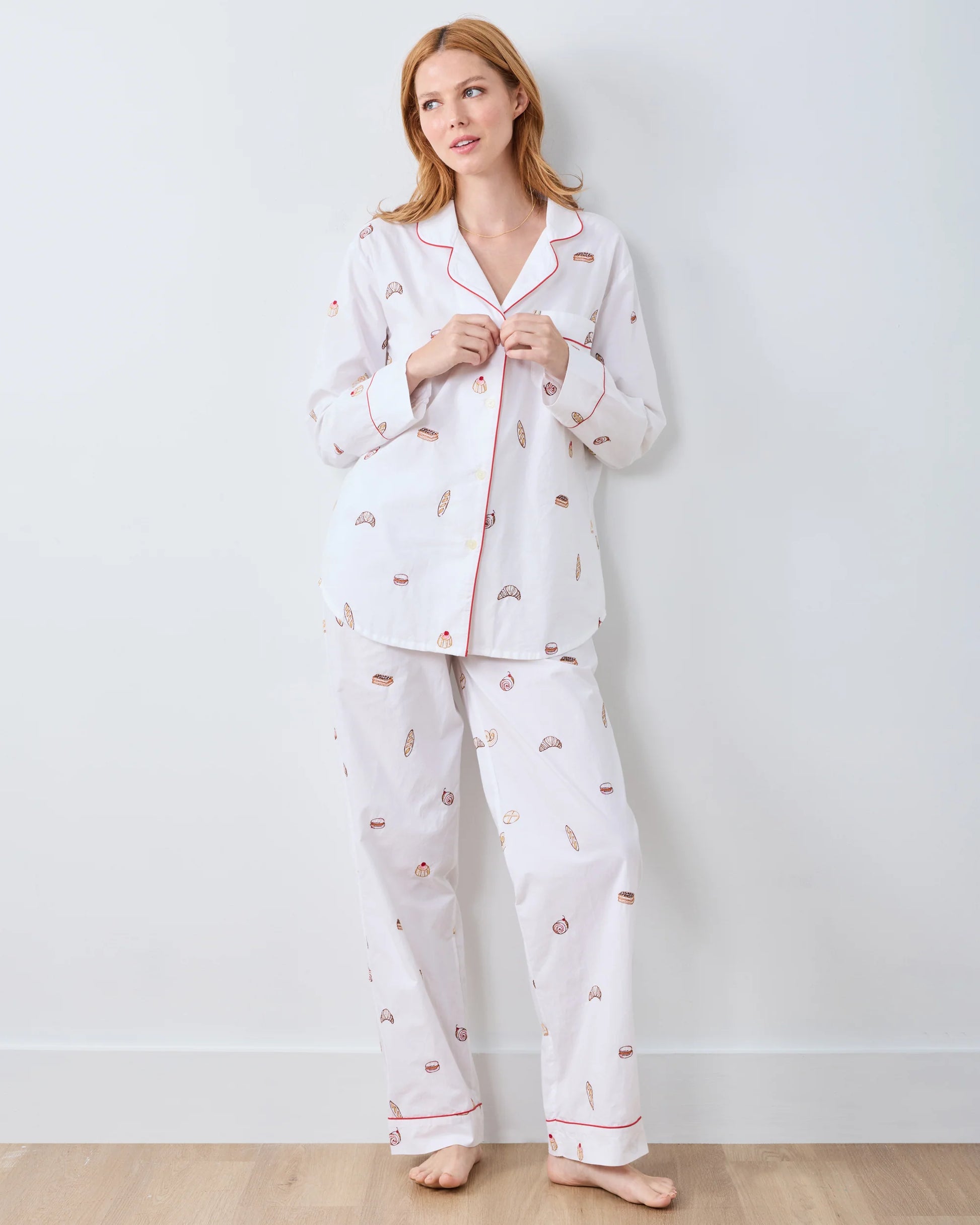 Make bedtime sweeter in our Freshly Baked embroidered cotton pajamas. These bakery-print pajamas feature assorted French pastries on soft organic cotton poplin. The long-sleeve pajama set includes a roomy button-down and comfortable mid-rise pants, creating an effortlessly chic silhouette. Embroidered pajamas for the baker in your life. Please note, this style does not include pockets.