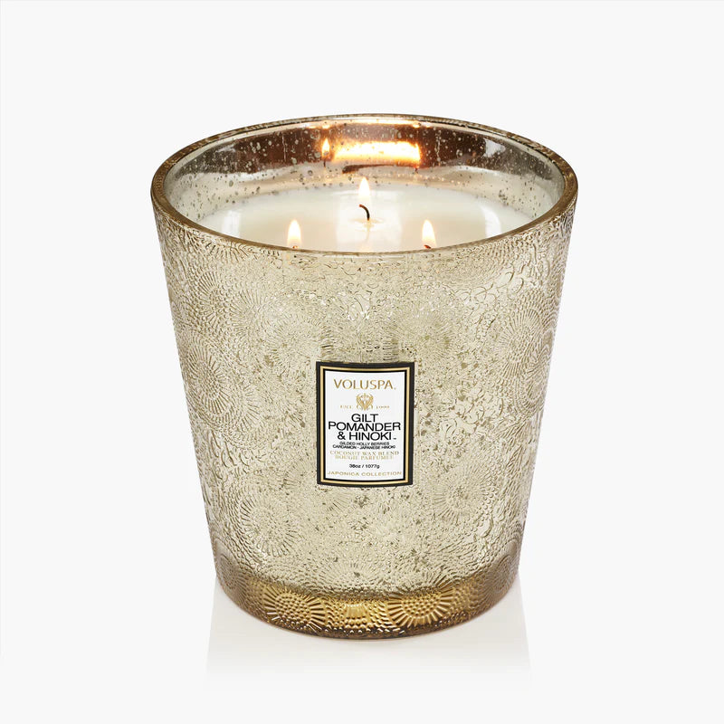 Voluspa's unique coconut wax blend is housed in a 38 oz. embossed glass jar with decorative gift box. Our three wicks allow you to enjoy fragrance throw for 80 hours. Our candles are handcrafted in the United States and feature our proprietary, clean-burning coconut wax blend and natural wicks. Our products are free of phthalates, parabens and sulfates and are never tested on animals. Up-cycle this best seller into a keepsake after the last burn.