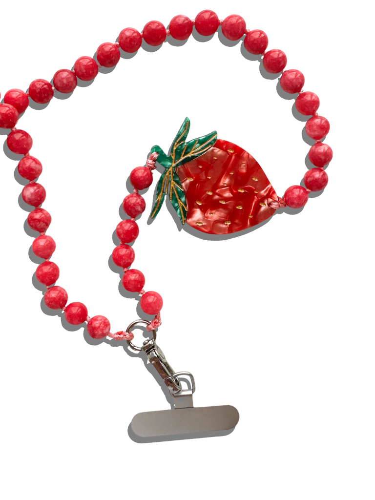 each chain features natural gemstone beads and our iconic hand-painted strawberry charm.