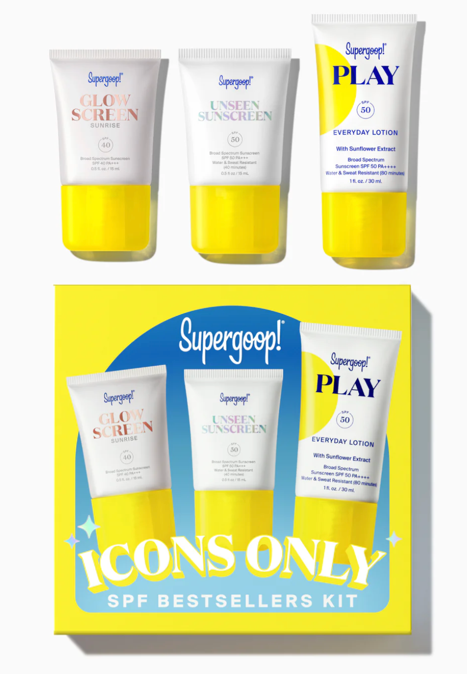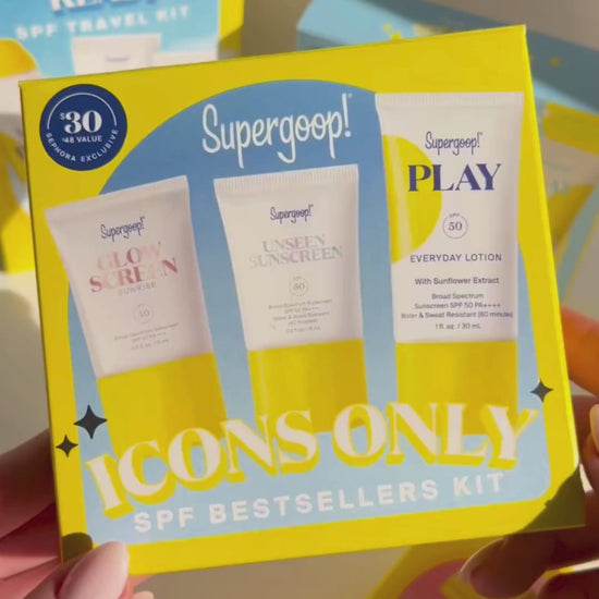This handy kit is the easiest way to try the sunscreen you've seen all over your feed or stock up on your faves before your next trip. Glowscreen SPF 40 is a glowy tinted sunscreen with a luminous, sunkissed finish that primes for makeup, visibly evens tone and is clinically tested to deliver all-day hydration*. Unseen Sunscreen SPF 50 is the iconic 100% invisible, weightless, scentless sunscreen that’s non-irritating, doubles as a primer for all-day makeup wear² and is clinically tested to improve skin clarity¹. PLAY Everyday Lotion SPF 50 is a fast-absorbing, non-greasy sunscreen face and body lotion that hydrates skin and is water- and sweat-resistant for 80 minutes.