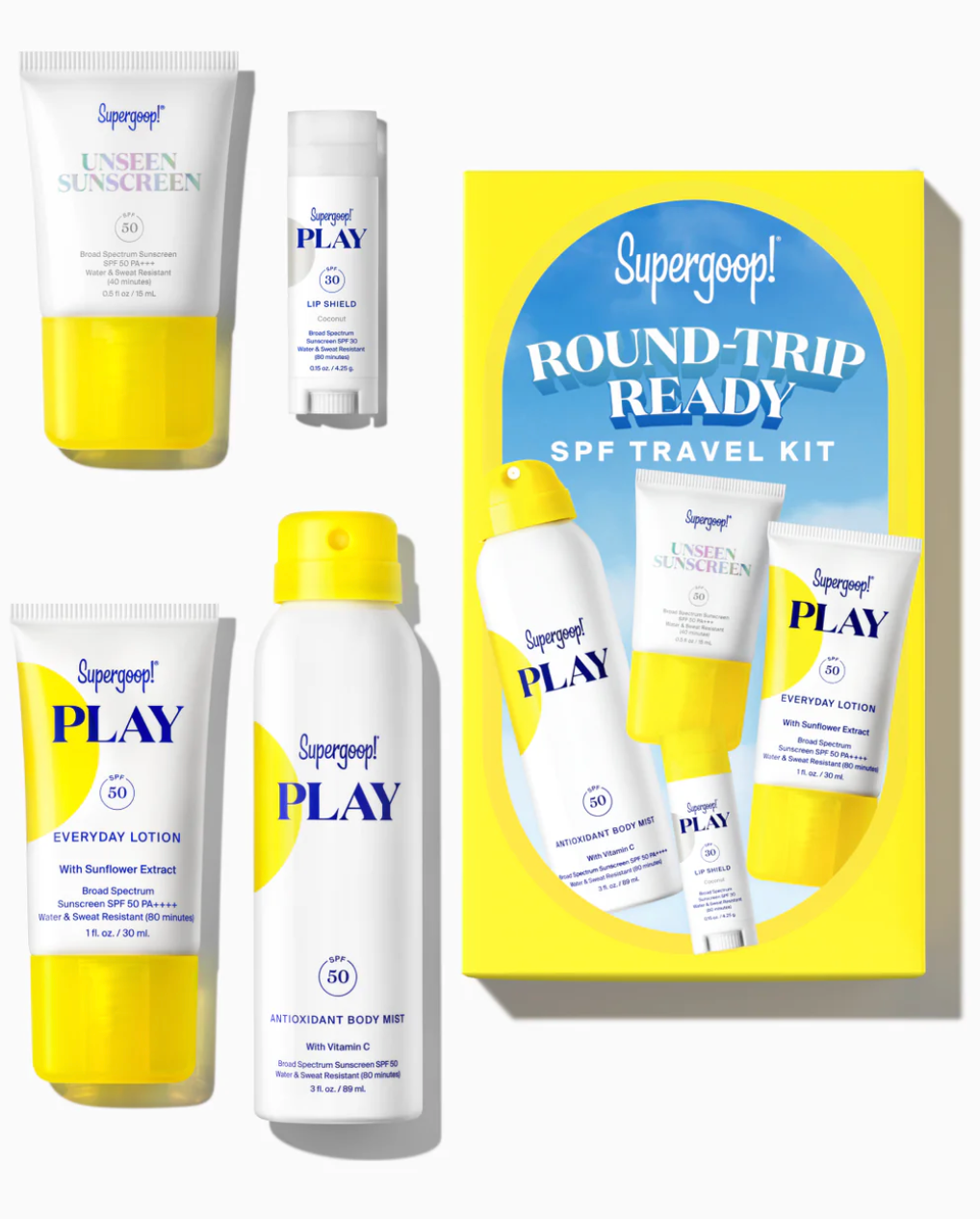 This kit features travel-sized sunscreen for face, body and lips so you can stay protected from head to toe, anywhere you go! Unseen Sunscreen SPF 50 is the iconic 100% invisible, weightless, scentless sunscreen that’s non-irritating, doubles as a primer for all-day makeup wear² and is clinically tested to improve skin clarity¹. PLAY Everyday Lotion SPF 50 is a fast-absorbing, non-greasy sunscreen face and body lotion that hydrates skin and is water- and sweat-resistant for 80 minutes. PLAY Antioxidant Body Mist SPF 50 is a weightless, non-aerosol sunscreen body spray that’s water- and sweat-resistant and leaves skin radiantly glowing. PLAY Lip Shield SPF 30 is a moisturizing lip balm stick that provides sun protection and helps visibly restore lips with antioxidant-rich coconut, avocado and grape seed oils.