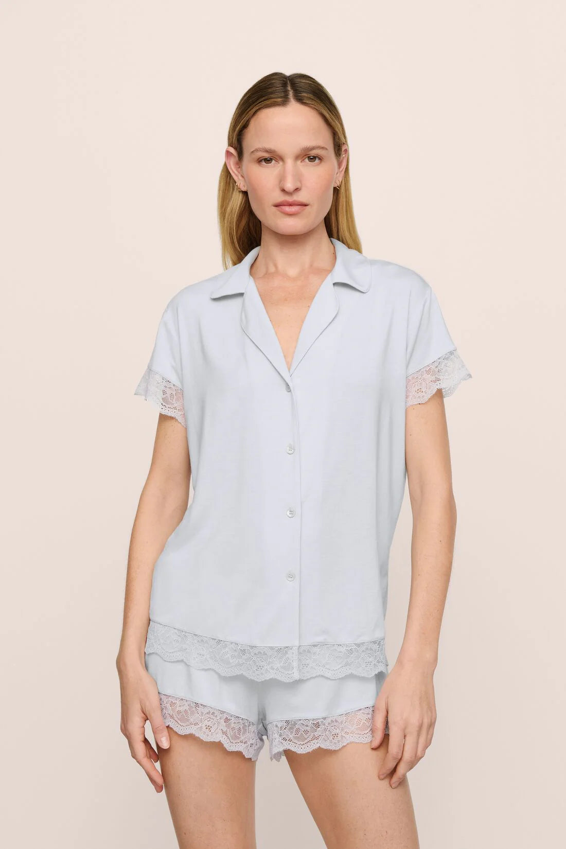 Romanticize your sleep. Made from TENCEL™ Modal fibers and a touch of elastane, this buttery soft fabric is verified by OEKO-TEX® Standard 100, meaning it’s dyed with safe and non-toxic dyes. This set features a short sleeve button front top with notch collar and a low-rise cheeky shot with an elastic waistband. This bridal-ready set pairs well with our Sherpa Slippers.