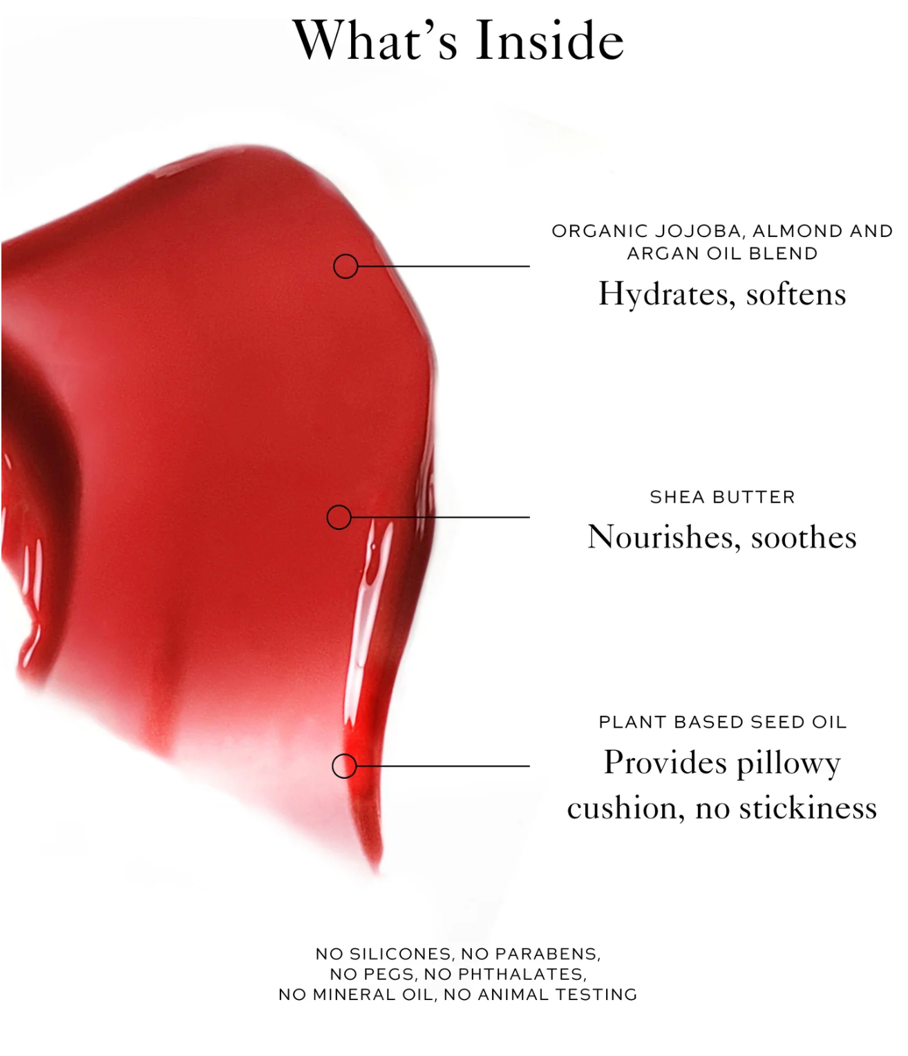 Tinted clean lip treatment that cushions lips with weightless, “juicy” nourishment to hydrate and protect. Naturally derived pigments, squeaky clean ingredients, and an innovative gel-oil system impart an unforgettable pillowy, luxurious sheen.