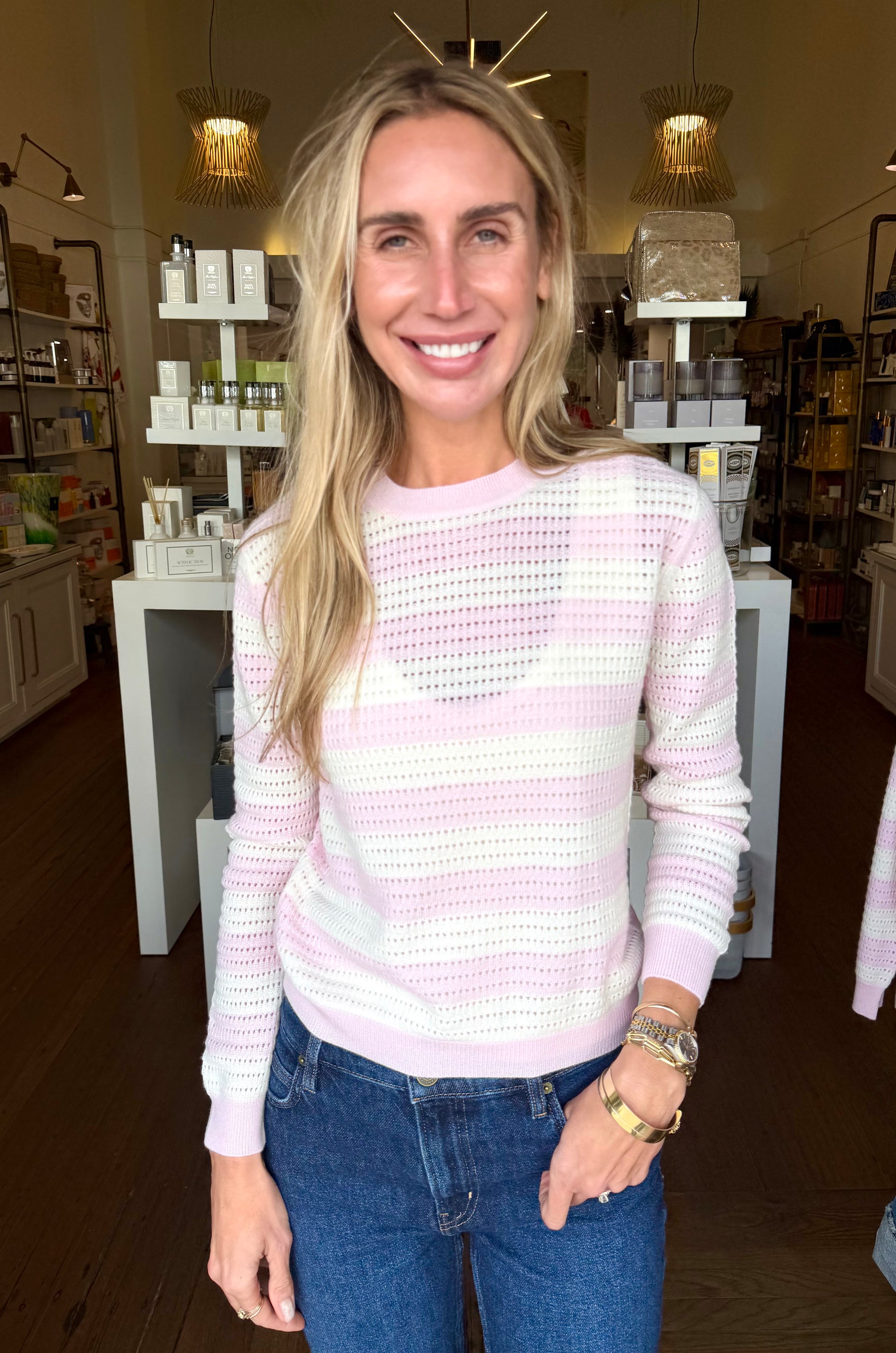 Introducing the Jumper 1234 Textured Stripe Crew Cashmere Sweater. Made with 100% cashmere, this lightweight jumper features unique textured 'hole' details. Available in true to size, this jumper is perfect for any fashion-forward individual seeking both style and comfort.