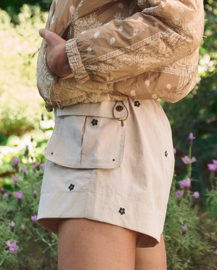 The twist comes in the details: delicate floral embroidery is thoughtfully scattered throughout, offering a quiet contrast to the rugged fabrication. Practical, playful, and perfectly balanced—this is utility with a soft heart.