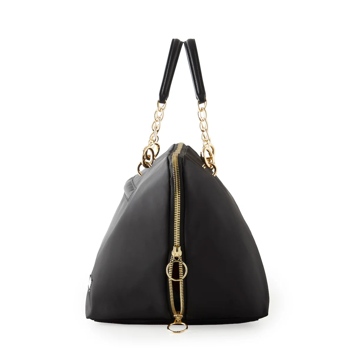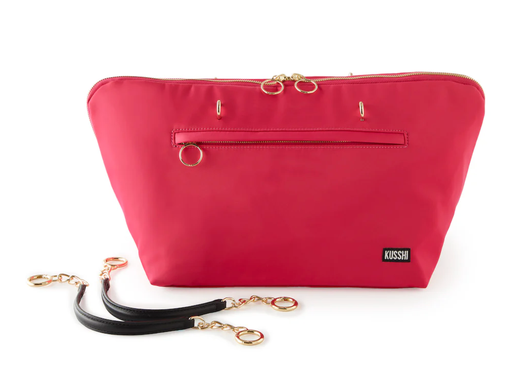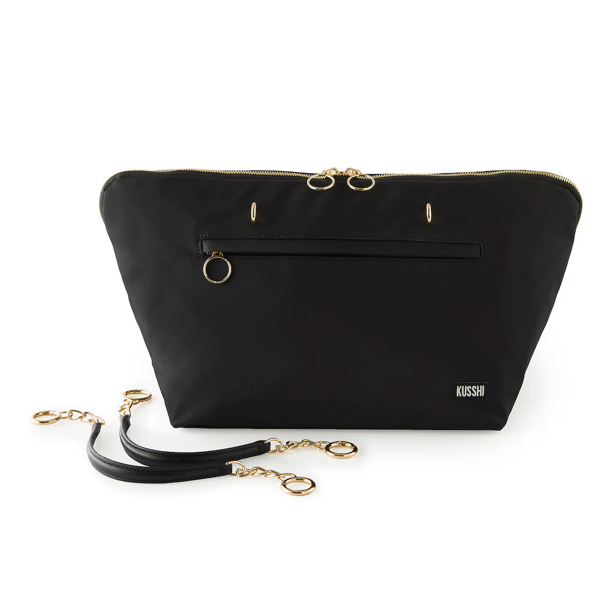 Our modern makeup train case sets a new standard of luxury for organization on the go. This large makeup bag doubles as zipper tote bag and provides ample space for an extensive beauty collection, or everyday items. It can also accommodate our other best selling cosmetic bags, snap-in organizers, and travel accessories. Our most generous sized offering, the Traveler is crafted in premium nylon with strong and durable chain-link leather handles that are removable to allow for machine washability. Designed with interior and exterior zipper pockets, six expandable mesh compartments, and dual closures that open wide on both sides for easy access to the products stored inside, the Traveler makeup case can also be used as a purse or work tote bag.