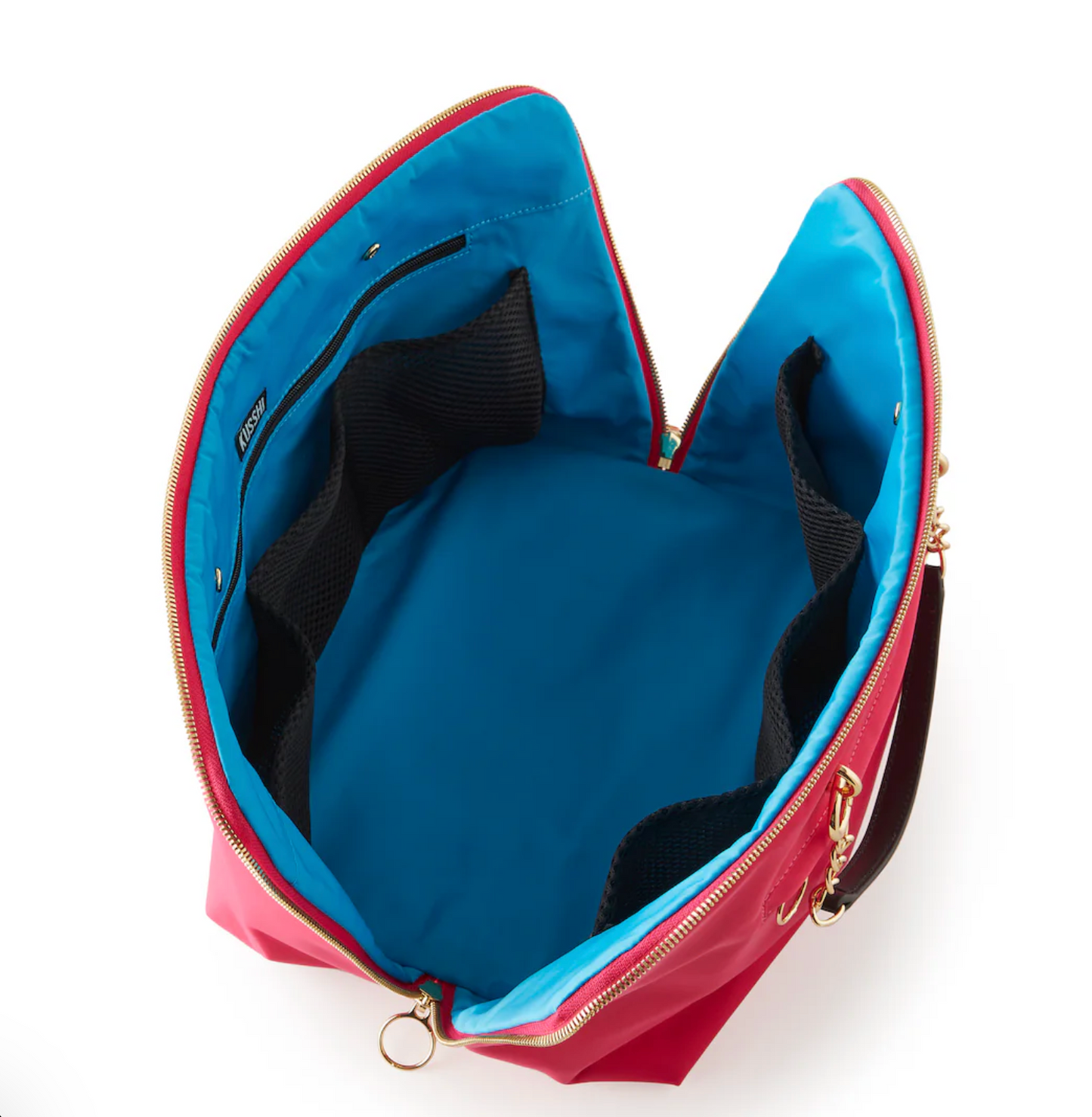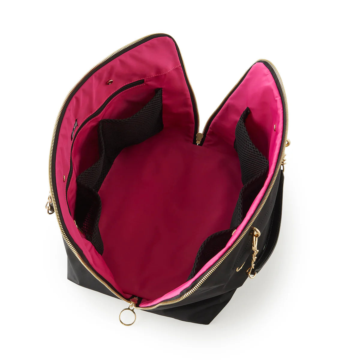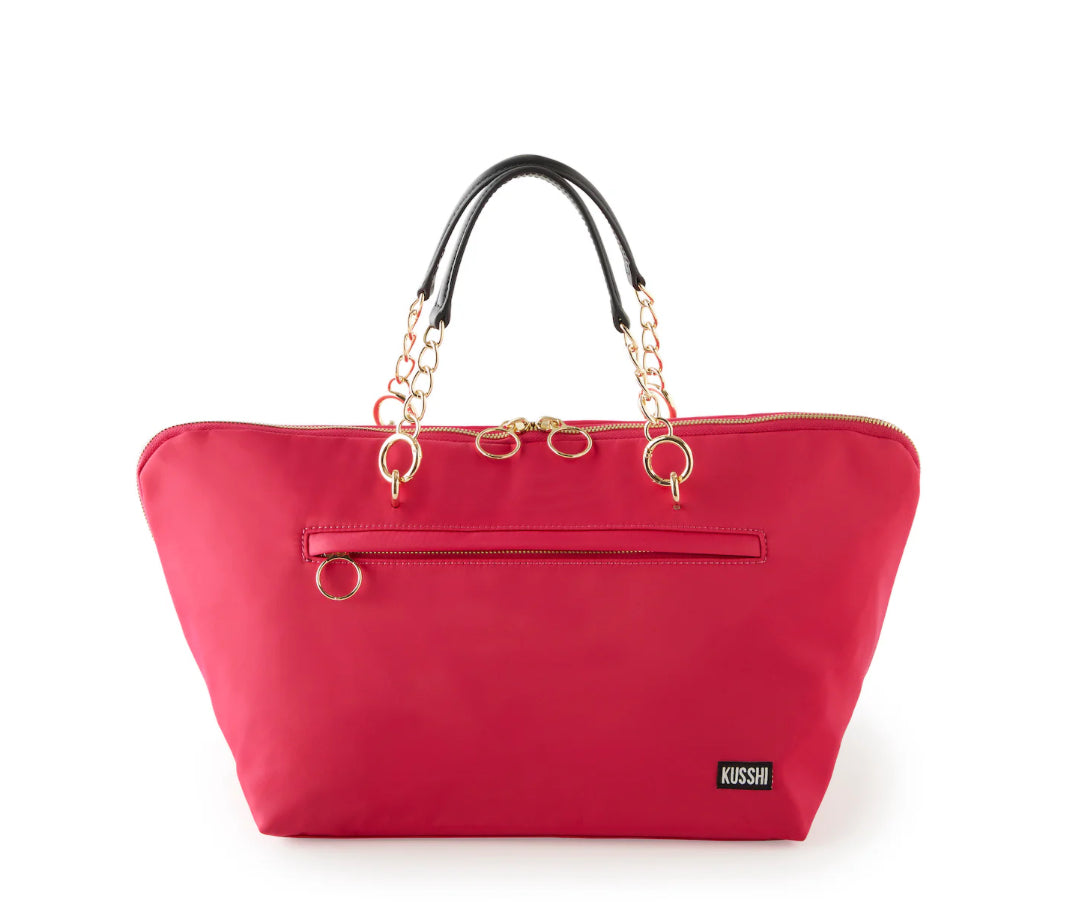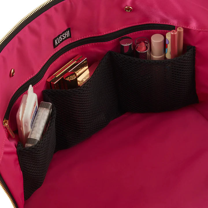 Our modern makeup train case sets a new standard of luxury for organization on the go. This large makeup bag doubles as zipper tote bag and provides ample space for an extensive beauty collection, or everyday items. It can also accommodate our other best selling cosmetic bags, snap-in organizers, and travel accessories. Our most generous sized offering, the Traveler is crafted in premium nylon with strong and durable chain-link leather handles that are removable to allow for machine washability. Designed with interior and exterior zipper pockets, six expandable mesh compartments, and dual closures that open wide on both sides for easy access to the products stored inside, the Traveler makeup case can also be used as a purse or work tote bag.
