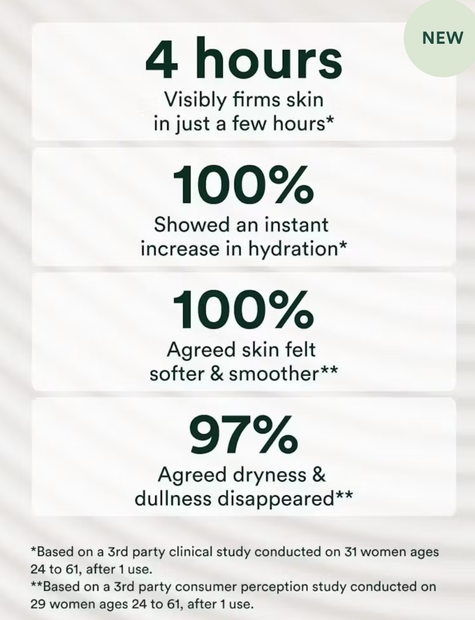Our ultra-hydrating, lightweight body lotion is scientifically proven to visibly firm skin in just 4 hours. Packed with clinically proven ingredients including vegan collagen and hyaluronic acid, to deliver lasting hydration for radiant, revitalized skin.