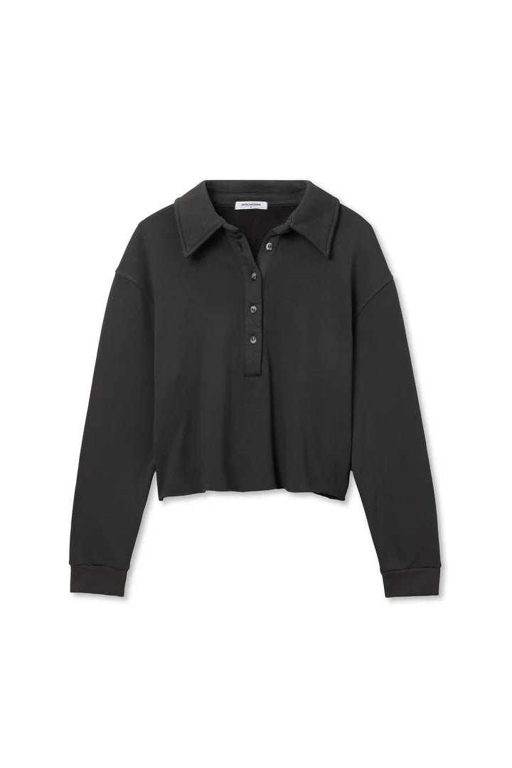 the vinny top is crafted from heavy fleece and finished with a raw hem for a relaxed, lived-in look. designed with a collared neckline and button placket, it brings a polished touch to a casual silhouette.