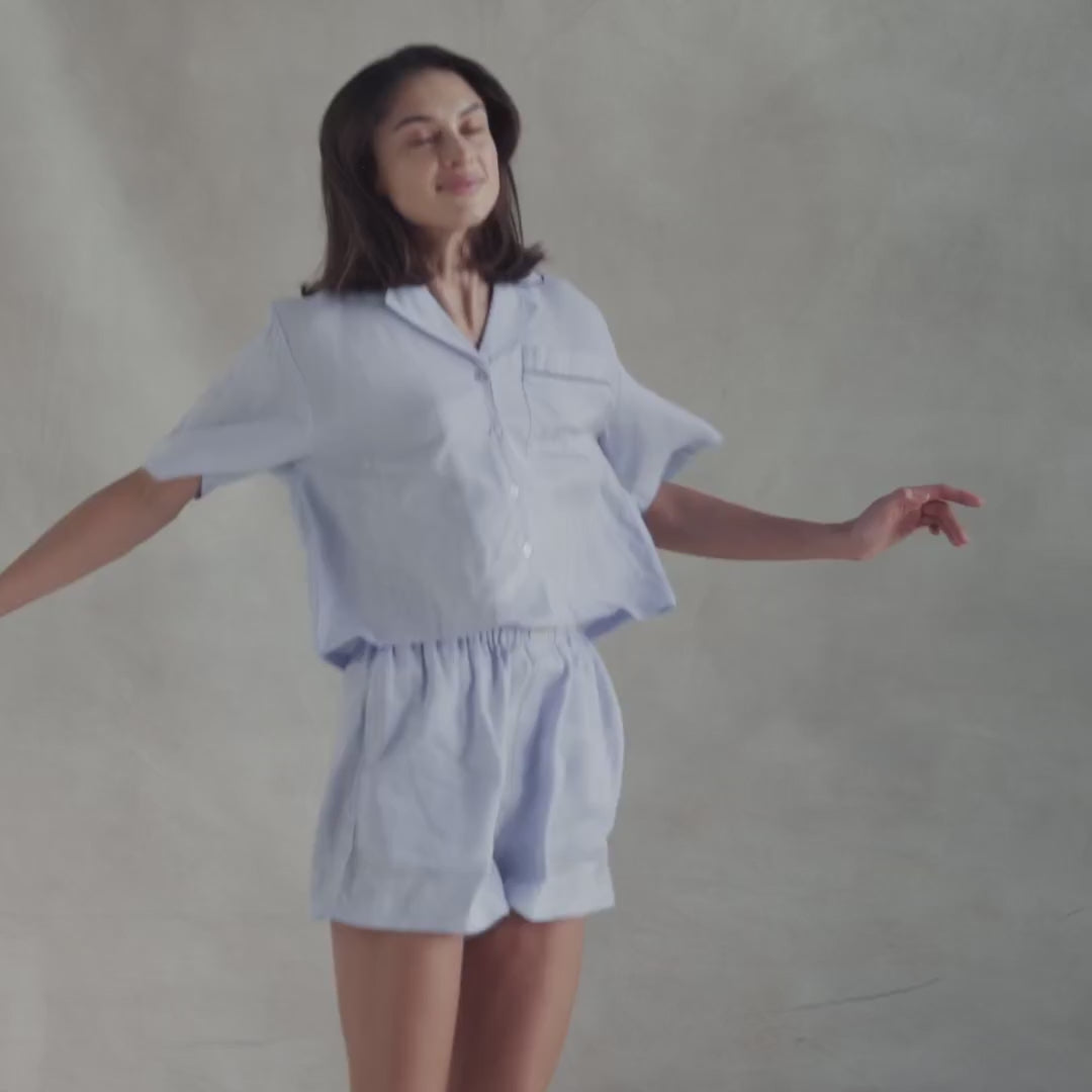 This short PJ set is made for warm nights and slow mornings. It's crafted from breathable, lightweight woven cotton with an exceptionally soft, crisp yet cozy feel. Designed exclusively for indoor wear, it features a relaxed silhouette, contrast piping, and our signature embroidery on its sleeve. It delivers quiet luxury for refined lounging and restful sleep.